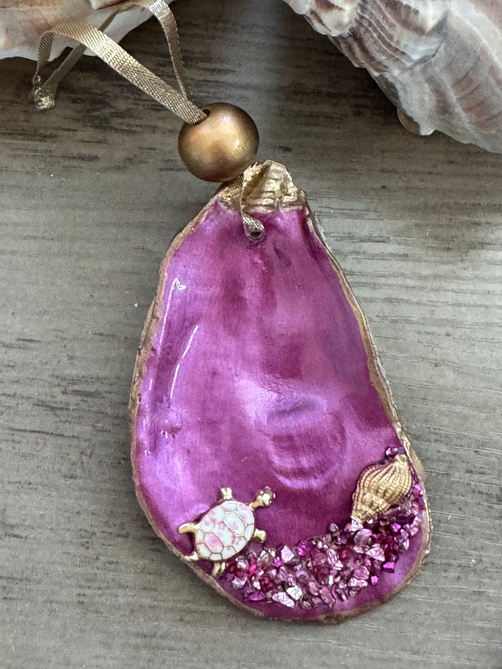 Add seaside sparkle to your holidays with these hand-painted oyster shell ornaments. Each shell is brushed in festive coastal colorsālike teal, fuchsia, sea mist green, and peacock blueāand finished with shimmering glass glitter and delicate coastal embellishments such as charms, pearls, or starfish.