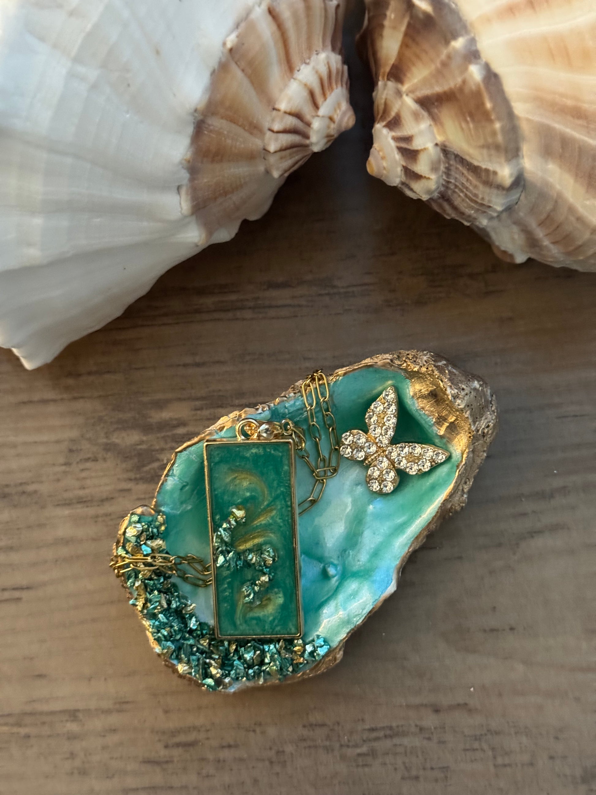 Light aqua tray with a color-shifting shimmer and crushed-glass rim. Adorned with a rhinestone butterfly and paired with a matching necklace—delicate, luminous, and gift-ready.